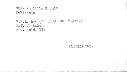 //// "Hör du lille ängel" //// Kvällsbön //// V.H.å. åcc.^nr 5379 Sn. Fagerad //// Ref. J. Kålen //// 6 v. sid. 112 //// VARBERG HUS. ////