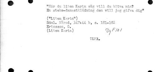 //// "Hor du liten Karin säg vill du bliva min? //// En steke-damastklädning den vill jag gifva dig" //// ("Liten Karin") //// Sdml. Härad, 347:44 b, s. 181-182 //// Ericsson, G. //// (Liten Karin) //// ULMA. ////