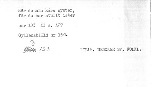 //// Hör du min kära syster, //// for du har stulit ister ! //// i //// n:r 133 II s. <427 //// Gyllenskicld nr 160. //// 3 TILLH. DEtlCKER SV. FOLKL. //// i //// i //// i //// ' //// ! ////