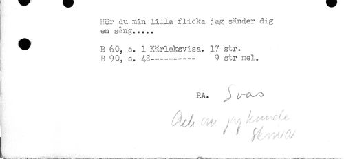 //// Hor du min lilla flicka jag sänder dig //// en sång..... //// ^ B 60, s. 1 Kärleksvisa. 17 str. //// B 90, s. ----—-- 9 str mel. //// i //// RA* //// / 'i F - /^t-t/' ^ J ////