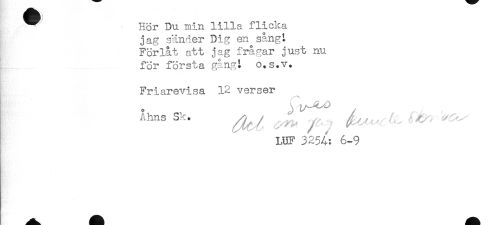 //// ^ Hör Du min lilla flicka //// jag sänder Dig en sång t //// Förlåt att jag frågar just nu //// for första gång!- o.s.v. //// Friarevisa 12 verser //// Sk. ^ ^ ^^^ ^ ^^ //// LUF 3254: 6-9 ////