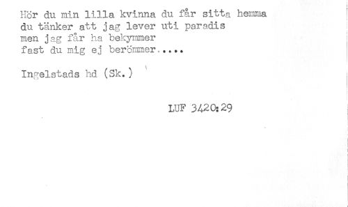 //// Hor du min lilla kvinna du iar sitta hemma //// du tänker att jag lever uti paradis //// men jag får ha bekymmer //// fast du mig ej berömmer..... //// In.Relstads hd (Sk. ) //// f //// t //// j //// i //// LUF 3420:29 //// i //// t //// ! //// t //// < //// i //// i //// * ////