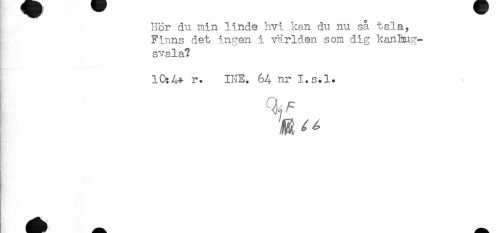 //// Hor du min linde hvi kan du nu så tala. //// Finns det ingen i världen som dig kan&ug- //// svala? //// 10:4+ r. INE. 64 nr I.s.l. ////
