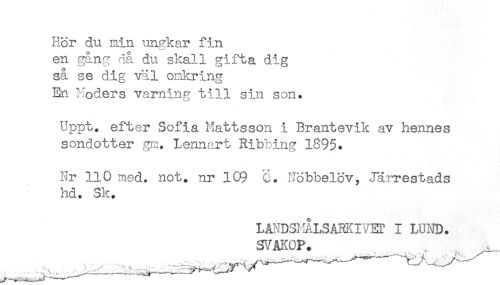 //// Hor du min ungkar fin //// en gång då du skall gifta dig //// så se dig väl omkring //// En Moders varning till sin son. //// Uppt. efter Sofia Mattsson i Brantevik av hennes //// sondotter gm. Lennart Ribbing 1895. //// Nr 110 med. not. nr 1C9 C-. NöbbelSv, Järrestads //// hd. Sk. //// LMDSmLSÅRKIVET I LUND. //// SVAKOP. ^ , - / ^ ////