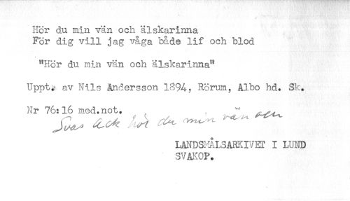 //// Hor du min vän och älskarinna //// For dig vill jag våga både lif och blod //// ^Hbr du min vän och älskarinna^ //// Uppt^ av Nils Andersson 18%, Rorum, Albo hd. Sk. //// Nr 76:16 med.not. " ^^ //// LÅNDSrdLSARKr^ET I LUND //// SVAKOP. ////