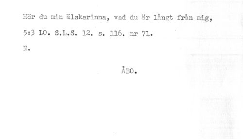 //// Hor du min älskarinna, vad du är långt från mig, //// 5:3 M. S.L.S. 12. s. 116. nr 71. //// N. //// ÅBO. //// * ////