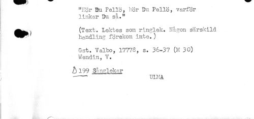 //// "Hör Bu Pellö, hör Du Pellö, varför //// linkar Du så.'^ //// ^^^ (Text. Lektes som ringlek. Någon särskild //// ^^ h^ndlin? förekom inte. ) //// Gst. Valbo, 17778, s. 36-37 (H 30) //// Wendin, V. //// A 199 Sånglekar //// ---ULMA //// ! //// . //// { //// * ////