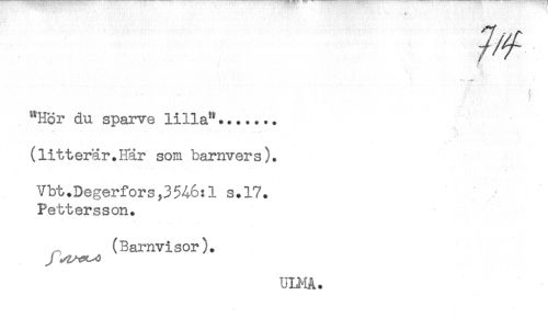 //// . - i * y //// ^Hör du sparve lilla^....... //// (litterär.Här som barnvers). //// t //// Vbt.Degerfors,3546:1 s.17. //// Pettersson. //// (Barnvisor). //// ULMÅ. ////