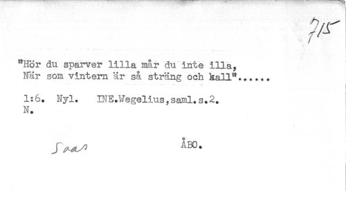 //// —' ' * ...........- t* .. . ... , //// "Hor du sparver lilla mår du inte illa. //// När som vintern är så sträng och hall"...... //// *** * *<** //// < //// 1:6. Nyl. INE.Vegelius,saml.s.2. //// N. //// < //// i //// ÅBO. ////