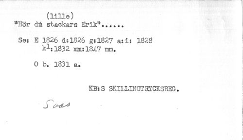 //// (lille) //// "Hör då stackars Erik"...... //// Se: E 1826 d:l826 g:1827 a:i: 1828 //// kl:1832 mm:1847 mm. //// O b. 1831 a. //// ! //// KB:S SKILMNGTHYCK3HEG. ! //// t //// } //// ] //// ! //// i //// ) //// < //// t ////