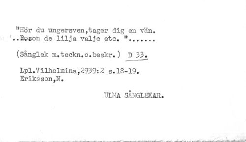 //// "Hör du ungersven ^tager dig en vän. //// r, ..Rpgon de lilja valje etc. //// (Sånglek m.teckn.o.beskr.) D 33. //// Lpl.Vilhelmina,2939:2 s.18-19. //// Eriksson,N. //// UniÅ SÅNGLEKAR. ////