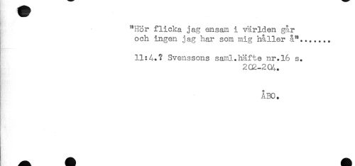 //// "Hor flicka jag ensam i världen går //// och ingen jag har som mig håller å*....... //// 11:A.? Svenssons saml.häfte nr.16 s. //// 202-204. //// ÅBO. ////