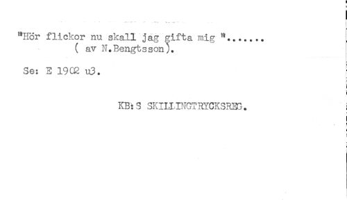 //// ; //// "Hör flickor nu skall jag gifta mig "....... //// ( av N.Bengtsson). //// Se: E 19CR u3. //// KB:S SKILLINGTRYCKSREG. i //// I //// i ////
