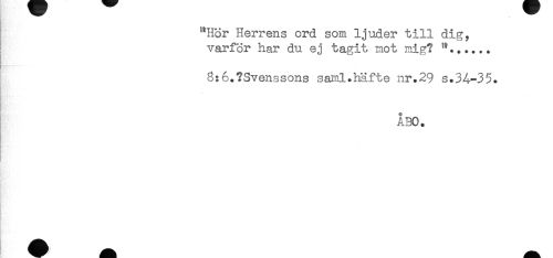 //// "Hor Herrens ord som ljuder till dig, //// varför har du ej tagit mot mig? //// h- — //// 8:6.?Svenssons saml.häfte nr.29 s.34-35. //// ÅBO. ////
