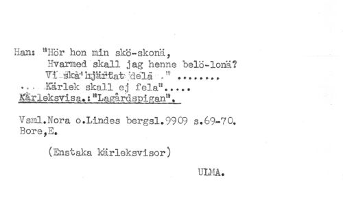 //// Han: "Hör hon min skö-skona, //// Hvarmed skall jag henne belö-lonä? //// Vi;-åkér'hjäf-Eat 'dela ." ........ //// ... Kärlek skall ej fela"..... //// Mårleksvisa.:"La^årdspiRan". //// Vsml.Nora o.Lindes bergsl.99CP s. 69-70. //// Bore^E. //// (Enstaka kärleksvisor) //// ULMÄ. ////