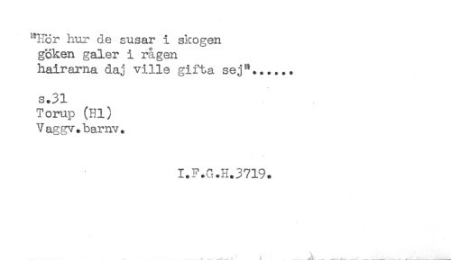 //// "Hör hur de susar i skogen //// göken galer i rågen //// hairarna daj ville gifta sej"....., //// s.31 //// Torup (Hl) //// Vaggv+barnv. //// I.F.G.H.3719. ////