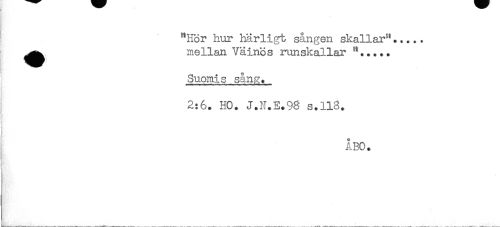 //// j "Hör hur härligt sången skallar^..... //// ^^ mellan Väinös runskallar .... //// Suomis såne;. //// 2:6. HO. J.N.E.98 s.118. //// I ÅBO. ////