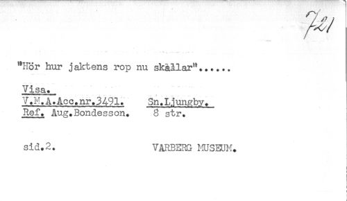 //// * ' - - . ... //// "Hör hur jaktens rop nu skållar"...... //// Visa. //// V.M.A.Äcc.nr.3A91. Sn.Ljungby. //// Ref, åug.Bondesson. 8 str. //// sid.2. VARBERG MUSEUM. //// ' //// t //// i //// ! //// ) //// ? //// i ////