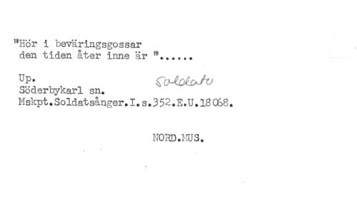 //// **Hör i beväringsgossar //// den tiden åter inne är //// Söderbykarl sn. //// Mskpt.Soldatsånger.I.s.352.E.U.18(^8. //// NORD.MUS, //// * ////