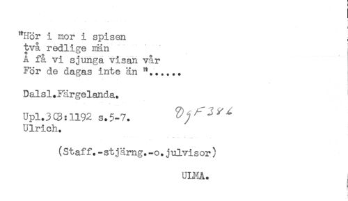 //// "Hör i mor i spisen //// två redlige män //// A få vi sjunga visan vår //// För de dagas inte än **...... //// . //// ! //// Dalsl.Färgelanda. //// T- * //// Upl.3Q3:1192s.5-7. //// Ulrich. //// (Staff.-stjärng.-o.julvisor) //// UIJMA. ////