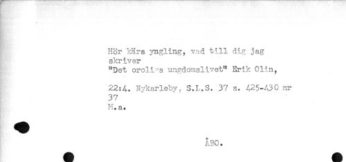 //// ^ ' ' ' ' //// - . //// - //// . //// Hör kära yngling, vad till dig jag //// skriver //// ^Det oroliga ungdomslivet^ Erik Olin, //// 22:4. Nvkarleby, S.L.S. 37 s. 425-430 nr //// 37 //// M.a. //// ÅBO. ////