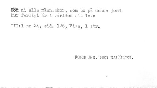 //// IKiR ni alla människor, som bo p^. denna jord //// hur farligt är i världen a't leva //// 1.11:1. nr 24, sid. 126, Visa, 1 str^ //// FORSLUND. HED DAIÄLVEN. ////