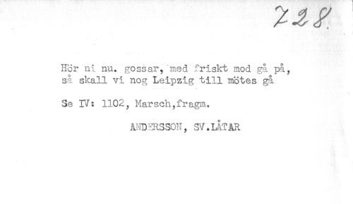//// Hor ni nu. gossar, med friskt mod gå på, //// sa skall vi nog Leipzig till mötes gå //// Se IV: 1102, Marsch,fragm. //// ANDERSSON, SV.LåTåR ////