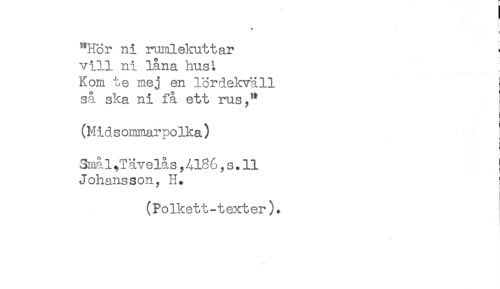 //// *'HSr ni rumlekuttar //// vil.l ni låna hus t //// Kom te mej en lördekväll //// så ska ni få ett rus/* //// (Hidsommarpolka) ^ //// i //// Smål,Tävelås,4186,s.11 //// Johansson, H. ! //// (Polkett-texter ////
