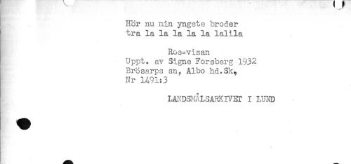 //// K Hor nu min yngste broder //// tra la la la la la lalila //// Roe-visan //// ) Uppt. av 3i.gne Forsberg 1932 //// [ Brösarrs sn, Albo hd*Sk, //// Nr 1491:3 //// I LMDS?#,LSÅRK.r7ET I LUND ////