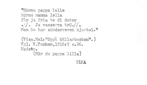 //// "Hömu pappa lelle //// hömu maJnma lella //// får ja fria te di doter //// ./'/. Ja vasserra trö*//. //// Men ho har sönderreven kjortel.^ //// (V i sa. Me 1: Uppå källarba cken^^. ) //// Vgl. V.Tunhem,15l6:5 s.26. //// Mads&n. //// (Hör du pappa lilla) //// UU-IA ////