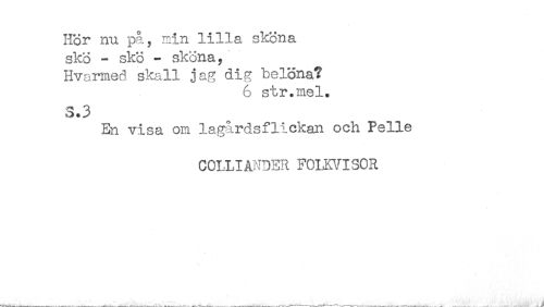 //// Hör nu på, min lilla sköna //// sko - skö - sköna, //// Hvarmed skall jag dig belöna? //// 6 str.mel. //// 3.3 //// En visa om lagårdsflickan och Pelle //// COLLIANDER FOLKVISOR ////