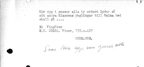 //// Hor opp i gossar alla ty ordern lyder så //// att andra klassens ynglingar till Malma hed //// skall gå .... //// So Vingåker //// E.U. 20L84. Visor, III.s.417 //// NORD.HUS. ////