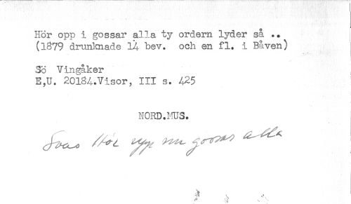 //// Hör opp i gossar alla ty ordern lyder så .. //// (1879 drunknade 14 bev. och en fl. i Bå ven) //// 3ö Vingåker //// E,U. 20l84.Visor, III s. 425 //// NORD.MUS. ////
