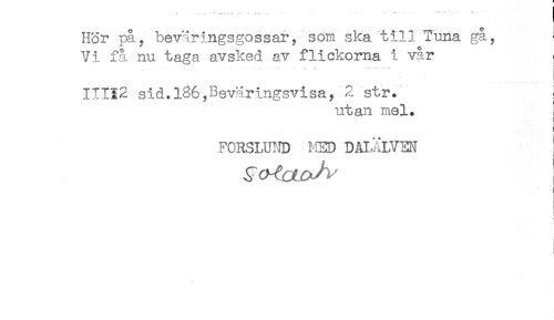 //// Hor på, beväringsgossar, som ska till Tuna gåy //// Vi få nu taga avsked av flickorna i vår , //// ... . - — v- //// IIH2 sid.l36yBeväringsvisa/2 str. i //// utan mel. j //// i //// FCRSLUMD HED DAI-ALVEN ! //// : ////