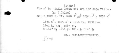 //// (Stina) //// : Hör på ho' lilla Greta ett ord jag säga vill... //// Se: E 1847 a, ff; 1848 c^ 1352 . 1853 k^ //// ' 1854 q": 1855 e*"' : 1856 rr; 1858 //// 1861 k, hh: 1867 jj, //// ! M 1849 f; 1854 g: 1855 j: 1861 b //// XB:s SKILLINGTRYCKSHEG. ////