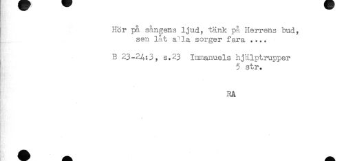 //// Hör på sångens ljud, tänk på Herrens bud, //// sen låt a*la sorger fara .... //// , B 23-2^:3, s.23 Inmanuels hjälptrupper //// ' 5 str. //// RA //// K ' -'"' 7 //// - //// < //// t . ////