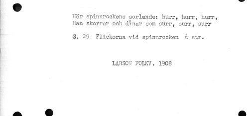 //// Hör spinnrockens sorlande: hurr, hurr, hurr, //// Han skorrar och dånar som surr, surr, surr //// S. 29 Flickorna vid spinnrocken 6 str. //// LARSON FOLKV. 1908 //// r //// - //// i ////