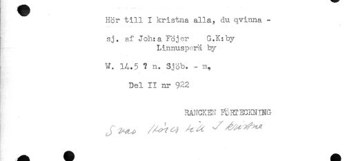 //// Hör till I kristna alla, du qvinna - //// sj. af Joh:aFöjer G.K:by //// Linnusperä by //// W. 14.5 ? n. Sjöb. - m, //// Del II nr 922 //// RANCKEN ^RTECm^ING //// J ^ - ^^ ////