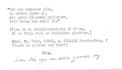 //// "Hbr.upp kamrater alla, //// ty ordern lyder så, //// att andra klassens ynglingar, //// till Malma hed skall gå." //// (Visa om en drunkning s o lycka på Båven, //// då en färja full av människor sjunkter.) //// Sdml. St. Malm, 1CQ22, s. 630-633 Nordin-Grip, I //// (Visor om olyckor och brott) //// ULMA. //// j ^ / ^ ^ .......^ p ^^ ^ //// . _ . __ _______- .-- ....------ . ^ , ____,t -----__^---.---- ------.------- --- . . . —. ////