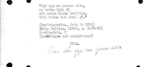 //// "Hör upp nu gossar alla, //// ty orden lyda så //// att andra klass beväring, //// till Malma. hed skall gå+" //// (Beväringsvisa, från år 1880) //// Sdml. Mellösa. 10166, s. 1107- 03) //// Nordin-Grip, I //// (Bevirings- och soldatvisor) //// UltMA. //// ^, - -, - ^ ^ ^ ////