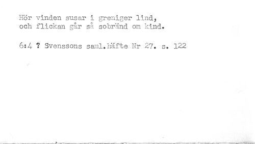 //// Hör vinden susar i greniger lind, //// och flickan går sa sohränd on kind. //// 6:4 ? Svenssons sanl.häfte Nr 27. s. 122 //// * ////