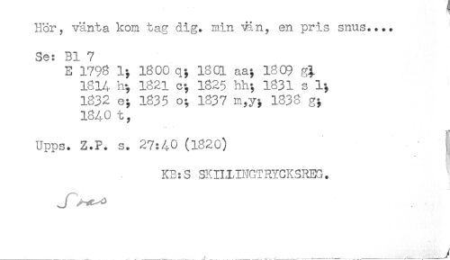 //// Hör, vänta kom tag dig. min Tän, en pris snus.... //// Se: Bl 7 //// E 1798 1; 1800 q; 18OL aa; 18C9 g^ //// 181/, h; 1821 c; 1825 hh; 1831 s 1; //// 1832 e; 1835 o; 1837 m,y; 1838 g; //// 1840 t, //// Upps. Z.?. s. 27:40 (l820) //// KB:S SKILLINGTRYCKSREK. //// J ////