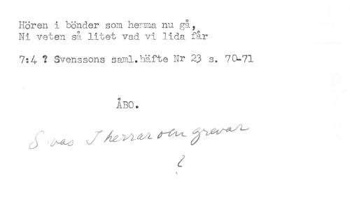 //// Hören i bönder som herrnia nu gå, //// Ni vet en så litet vad vi lida får //// 7:4 ? Svenssons saml. häfte Nr 23 s. 70-71 //// ÅBO. ////