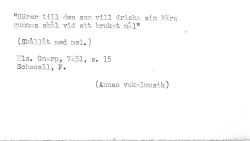 //// florer till den som vill dricka sin kära //// gujamas skål vid ett brukat mål" //// (Skållat med mel.) //// Hls. Gnarp, 7251, s. 15 //// Schenell, P. //// (Annan vokalmusik) ////