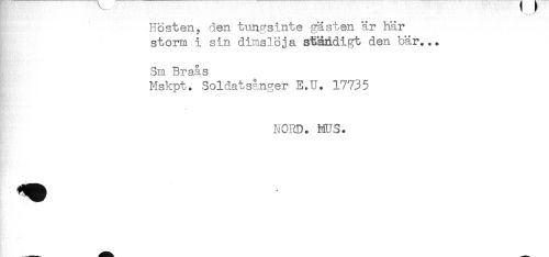 //// Hösten, den tungsinte gästen är här //// storm i sin dimslöja ständigt den bär... //// . //// . //// Sm Braås //// Mskpt. Soldatsånger E.U. 17735 //// NORD. MUS. ////