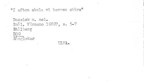 //// "I afton skola vi havren skära" //// Danslek m. mel. //// Smal. Värnamo 108C7, s. 5-7 //// Stålberg //// D30_ ! //// Sånglekar ' //// UU-IA. ! //// i //// i //// / ////