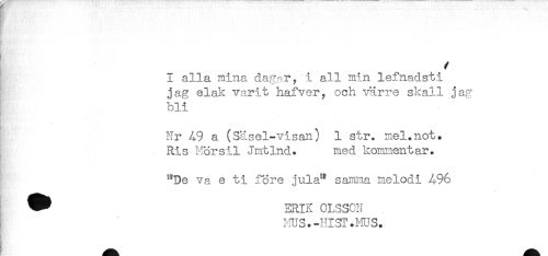 //// i //// I alla mina dag^r, i all min lefnadsti //// jag elak varit hafver? och värre skall jag //// bli //// i //// Nr 49 a (Säsel-visan) 1 str. mel.not. //// Ris Morsil Jmtlnd. med kommentar. //// * //// **De va e ti före jula" saimna melodi 496 //// " ERIK OLSSON //// i.ms.-msr.ms. ////