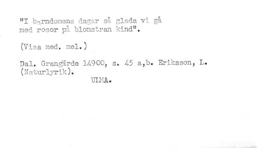 //// "I barndomens dagar så glada vi gå //// med rosor på blomstran kind^. //// (Visa med. mel.) //// Dal. Grangärde 14900, s. 45 a,b. Eriksson, L. //// (Naturlyrik). //// UI1IÅ* ////