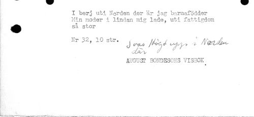 //// I berj uti Norden der är jag barnafbdder //// Min noder i lindan mig lade, uti fattigdom //// ^^ så stor //// AUGUST BONDESONS VISBOK //// * ////