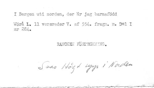 //// I Bergen uti norden, der är jag barnafödd //// Mora L. 11 versrader V. af 554. fragm. m. Del I //// nr 284. //// 3ANCKEN FÖRTECKNING. ////